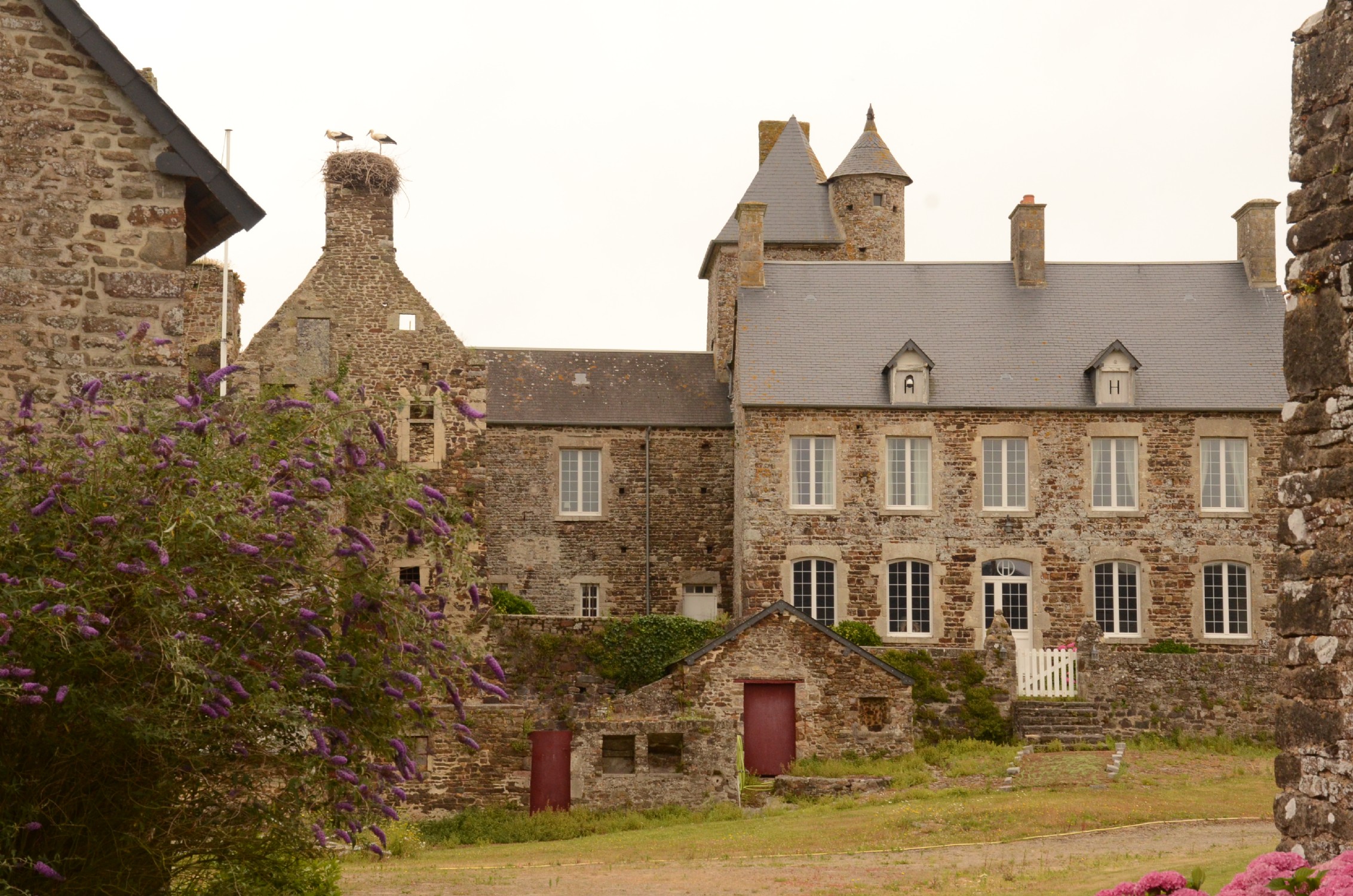 Ca. 10 km vest for Bayeux gør vi holdt ved en smuk gammel gård, hvor et storkepar har bygget rede på skorstenen.